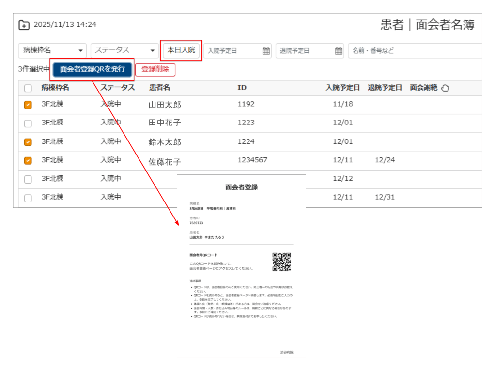 入館時にタブレットで電話番号を入力すると、フリーパス対象または当日の面会予約がある患者が一覧で表示され、対象の患者を選択して面会できるようになりました。
