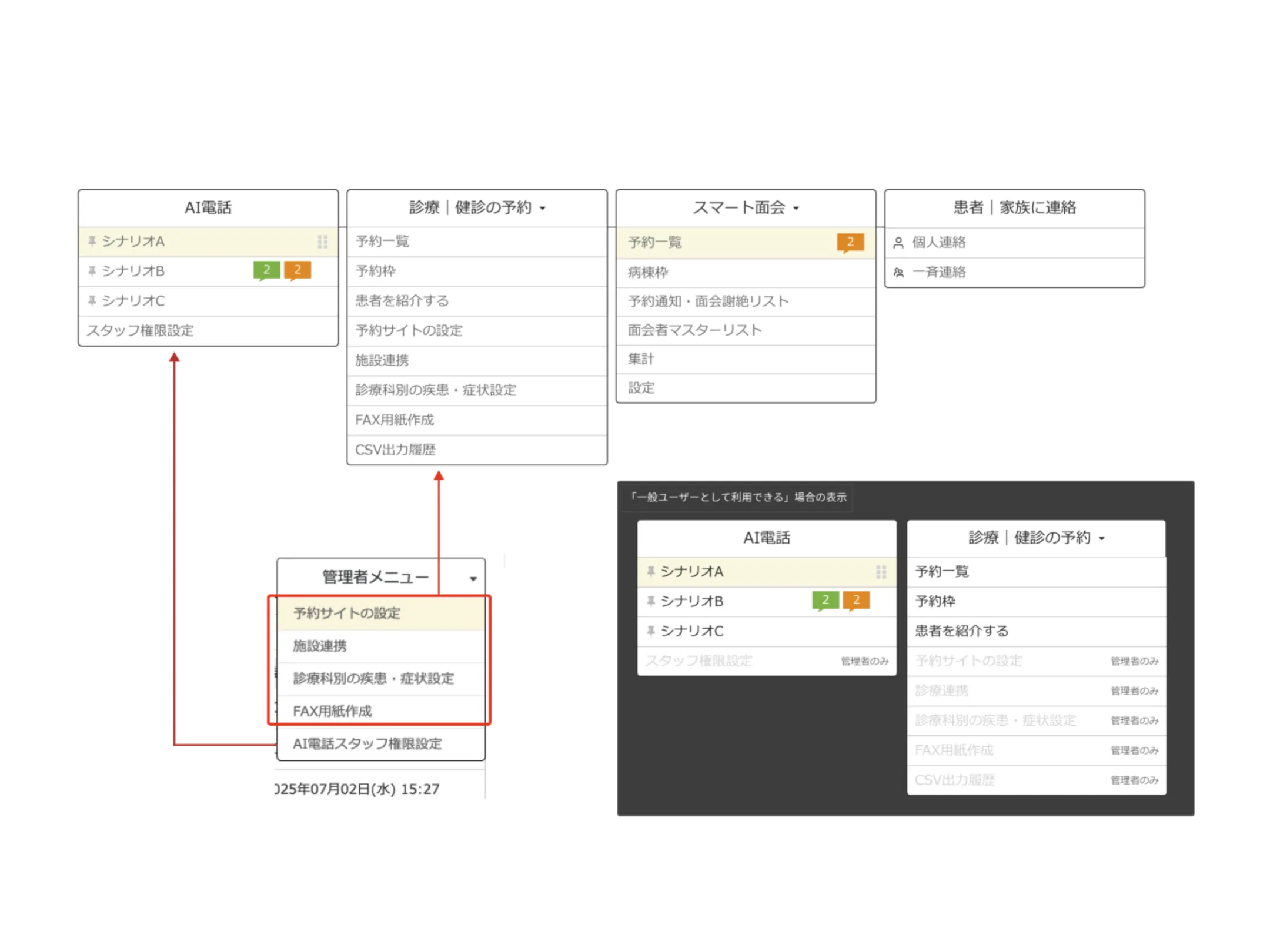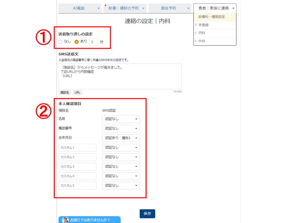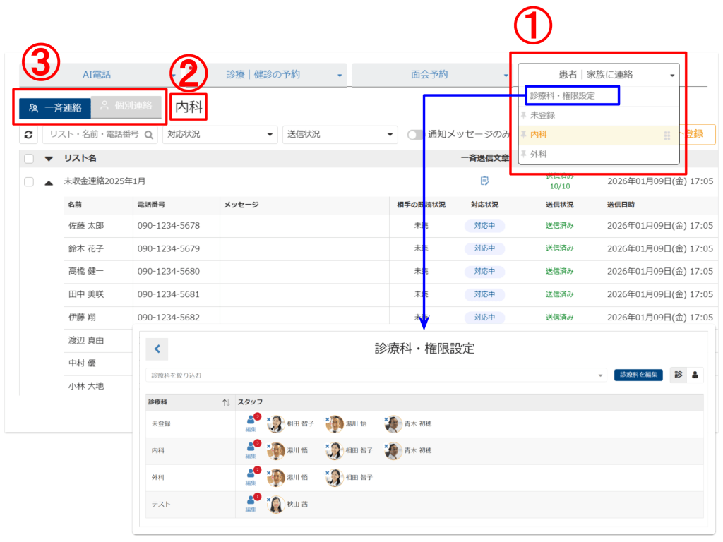 ① 「診療科・権限設定」で任意のグループと閲覧者を設定できます。設定した部署名をタブ内へ表示し、AI電話と同様にピン留めや並び替えが行えます。