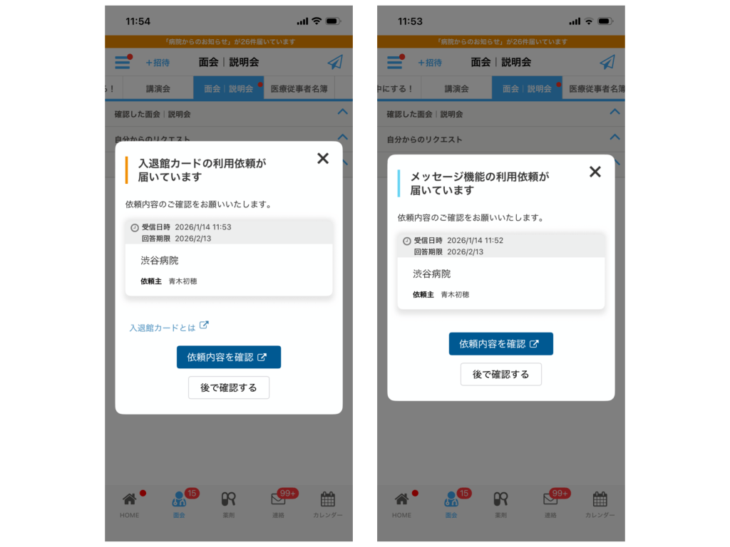 従来は設定時間外の場合、医療従事者側からのリクエスト送信も制限されていましたが、本対応により個人設定による制限を解除しました。一方で、病院設定の面会時間による制限は従来通り維持しています。面会時間外に送信する際は注意ポップアップを表示し、確認後に送信可能とすることで、運用上の柔軟性と安全性を両立しています。メーカー側から病院へのリクエスト送信制限や既存設定には影響ありません。