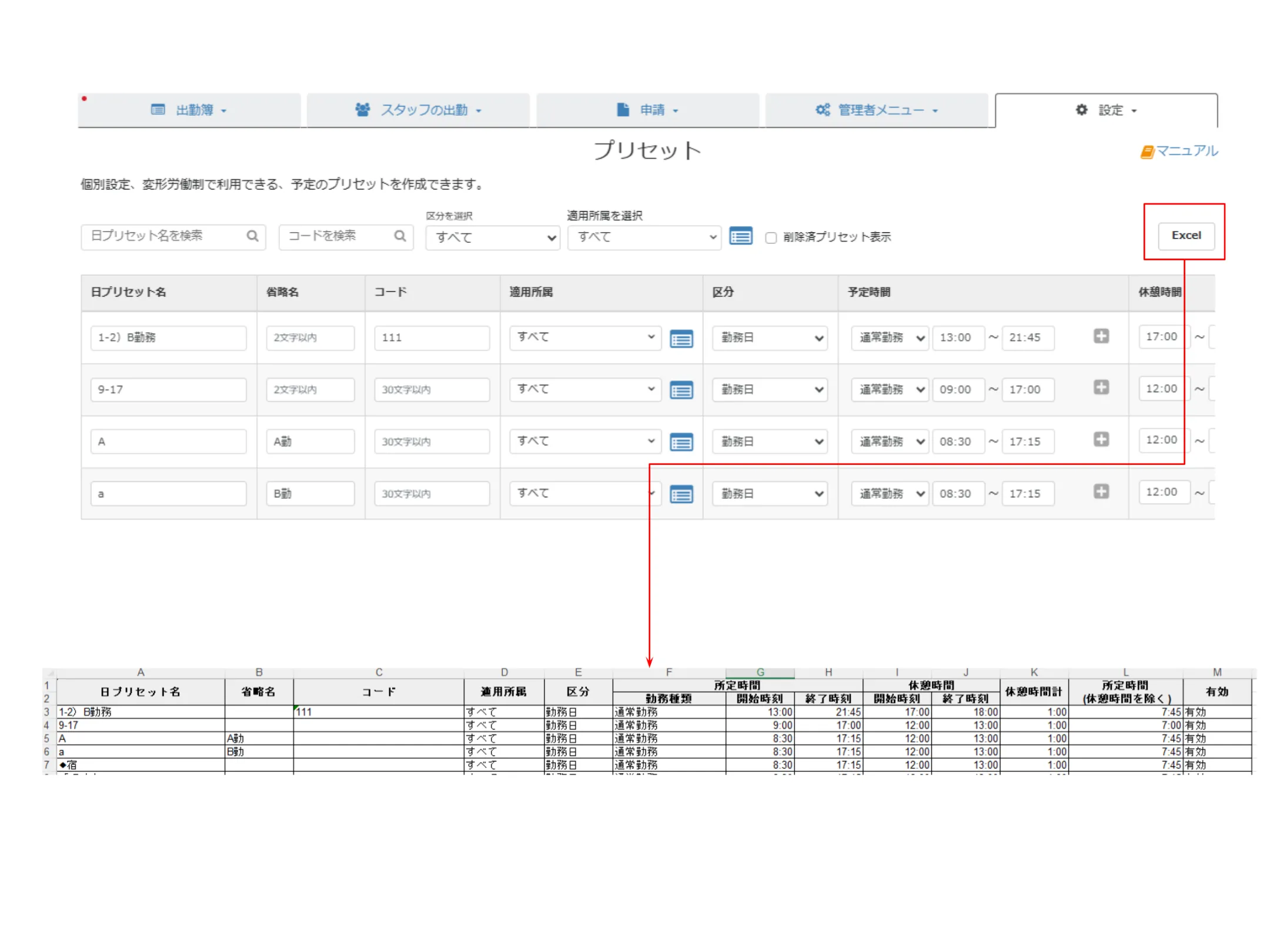 ①休暇簿および勤務管理簿の出力形式を、PDF出力からExcel形式へ変更いたします。