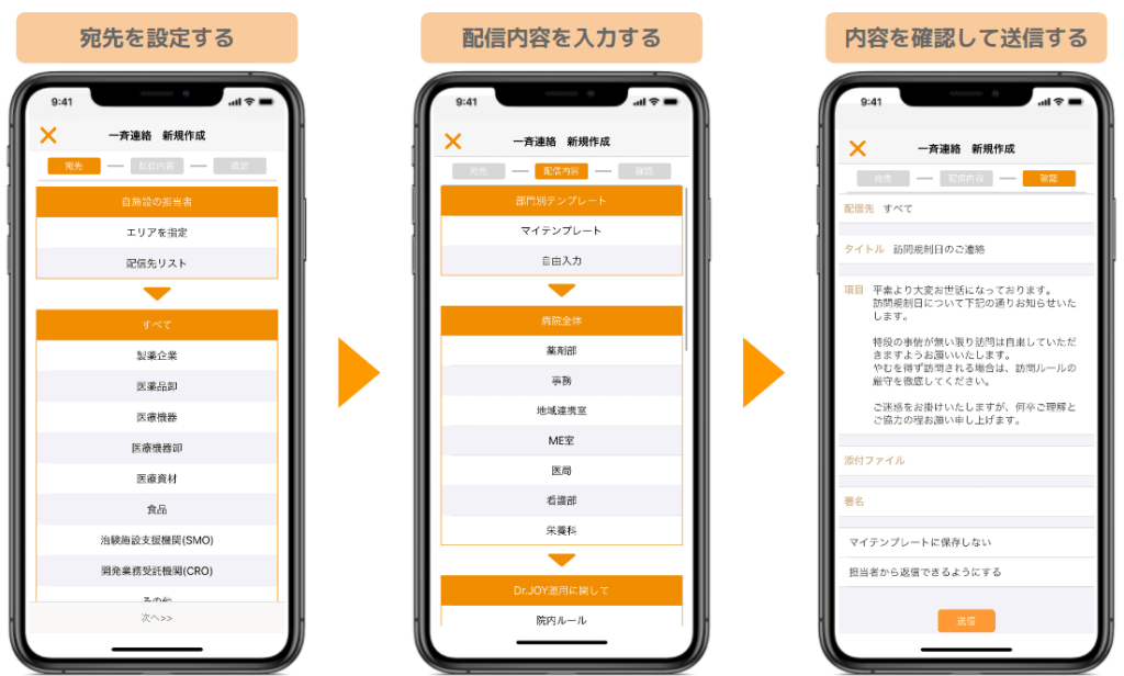 これまでは、WEB版のDr.JOYからのみ「担当者へ一斉連絡」の機能がご利用いただけましたが、医療者様の利便性の向上を目的に、Dr.JOYアプリにも同様の「担当者へ一斉連絡」を追加しました。