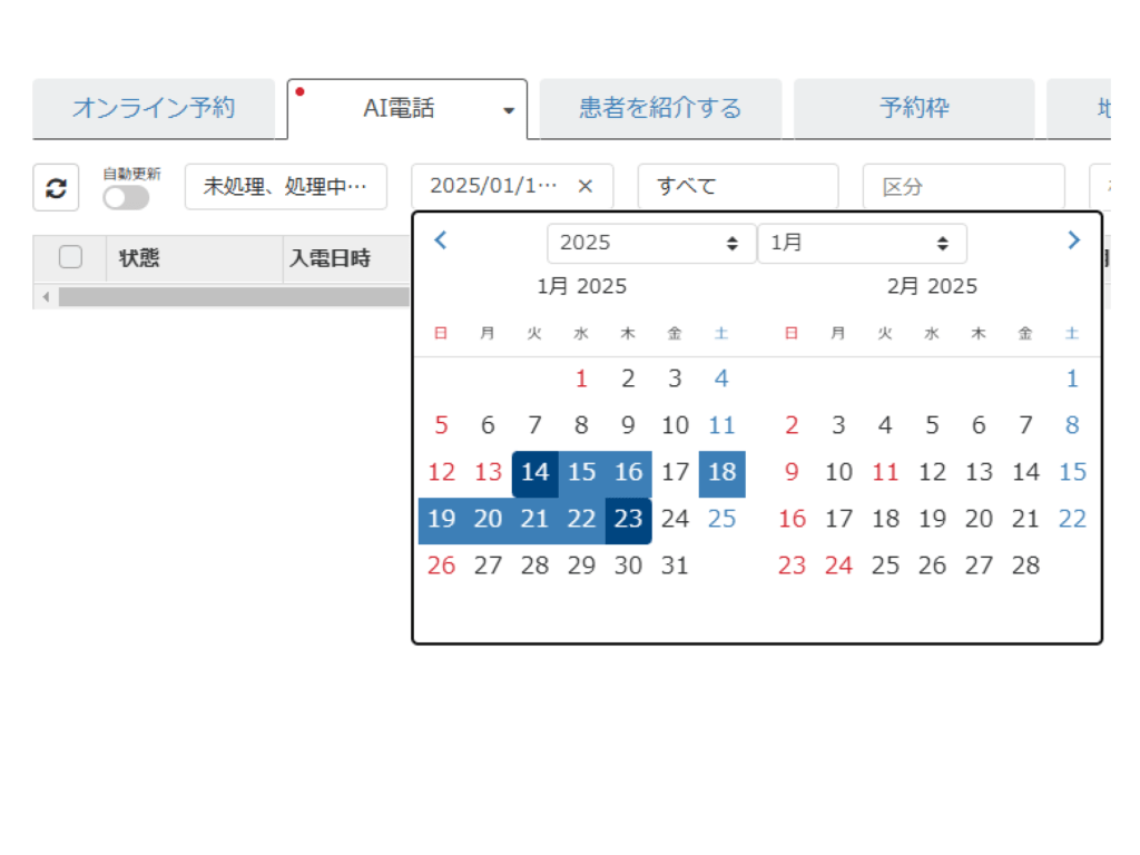 【入電日(AI電話)、予約日(オンライン予約)を期間指定し絞り込みができる様になりました】
