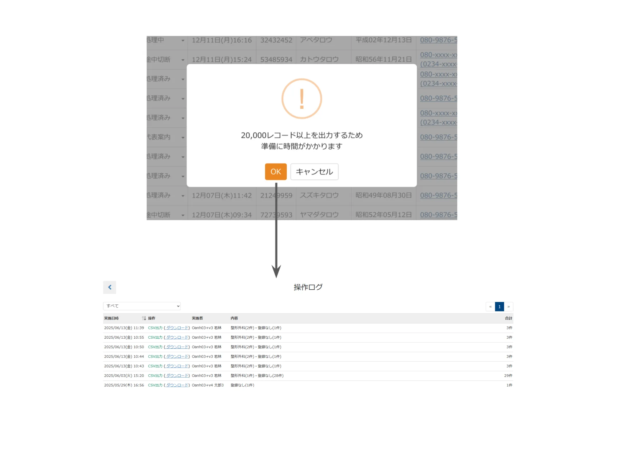 20,000件以上を出力する場合、ダウンロードに時間がかかるため、OKボタンを押すと自動的に操作ログ画面へ遷移します。