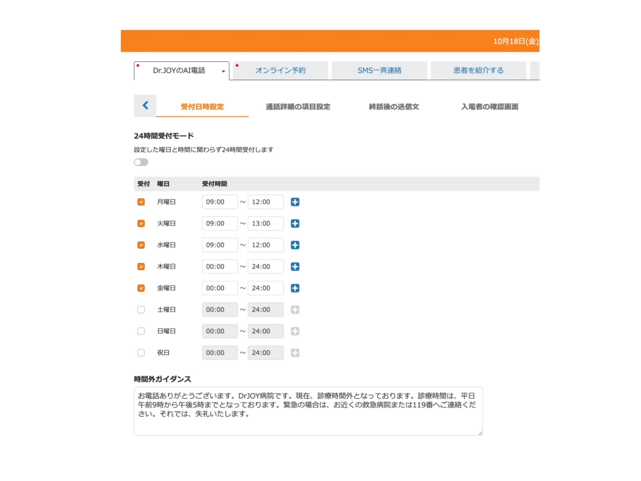 ①24時間受付するモードを追加しました。※基本はOFFになっており、緊急で受付する場合などに一時的にご活用ください。
