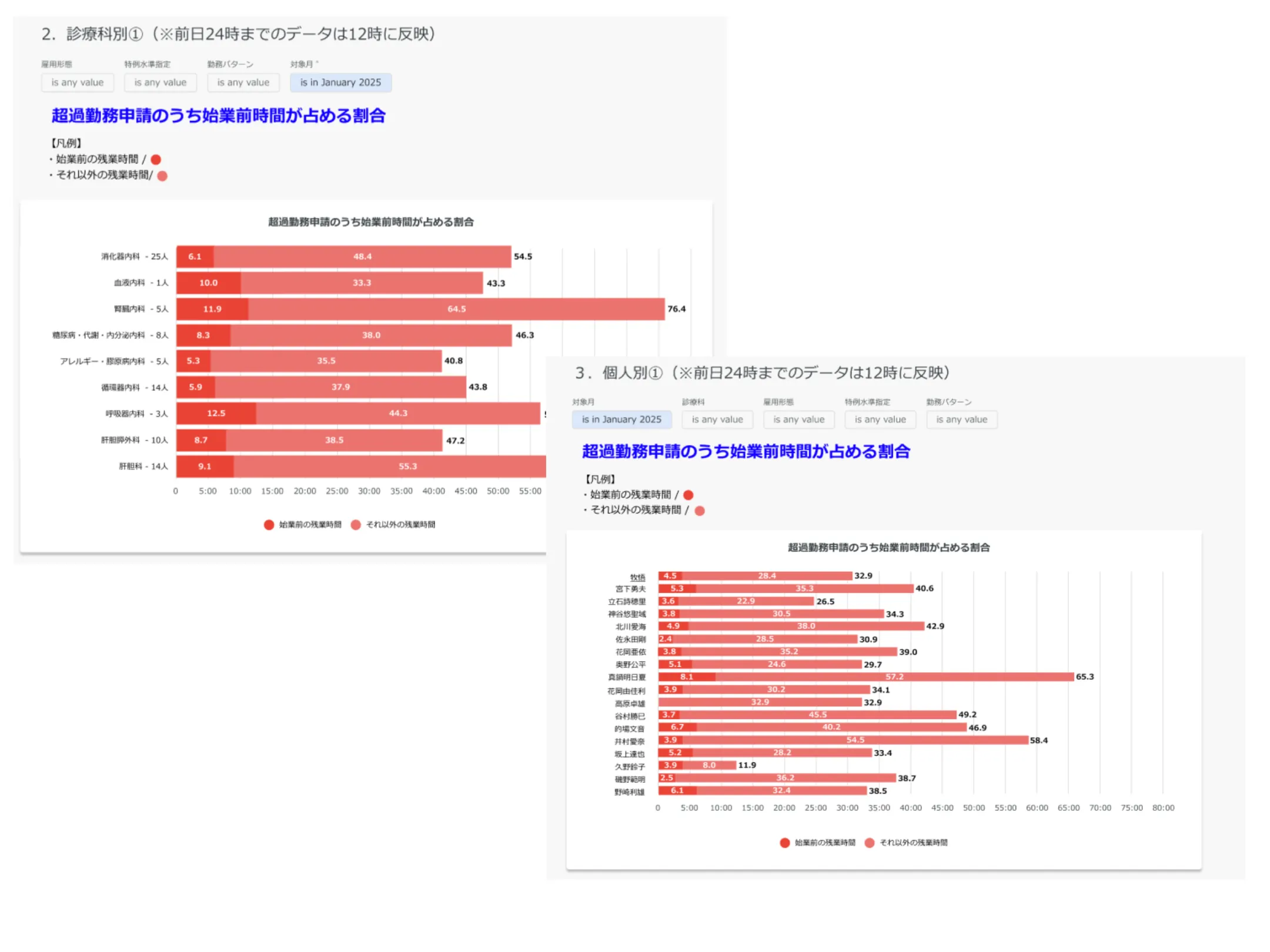 超過勤務申請のうち始業開始前時間が占める割合を表示します。