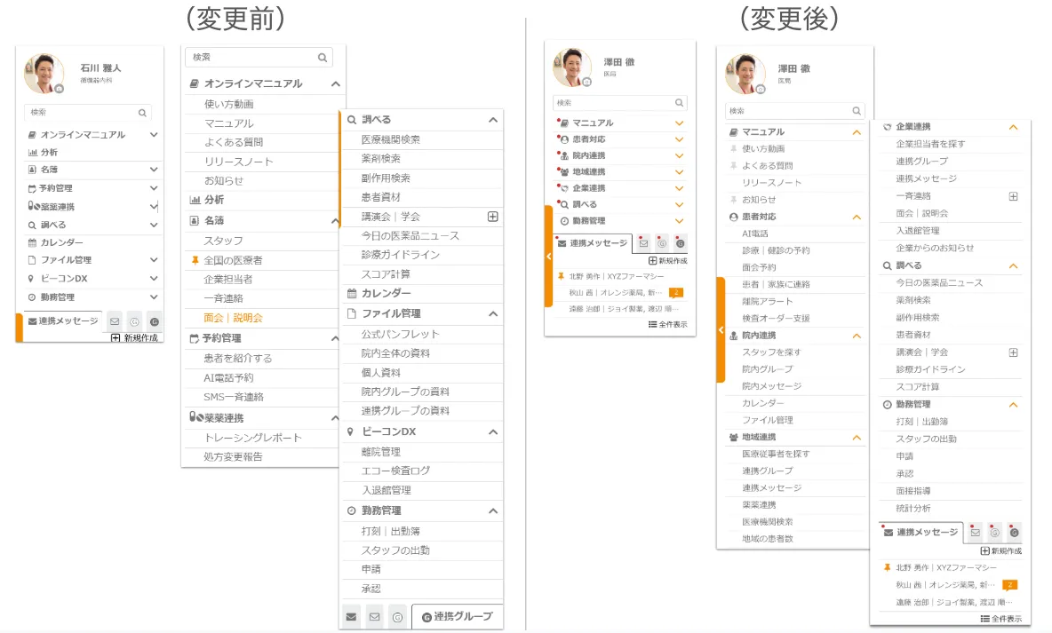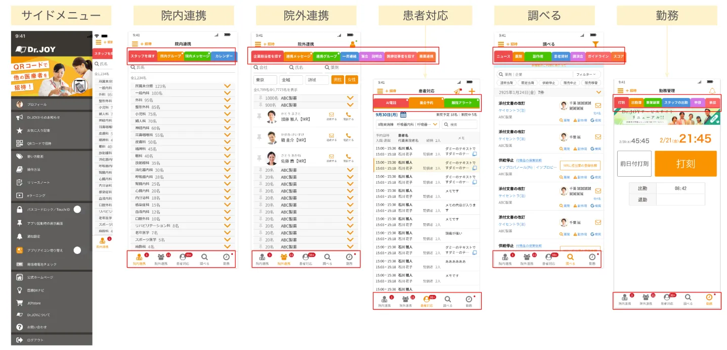 - サイドメニューの「AI電話予約」「離院管理」「薬薬連携」をボトムナビゲーション「患者対応」内へ移動し、「医療DXナビ」「JOYStore」を追加配置