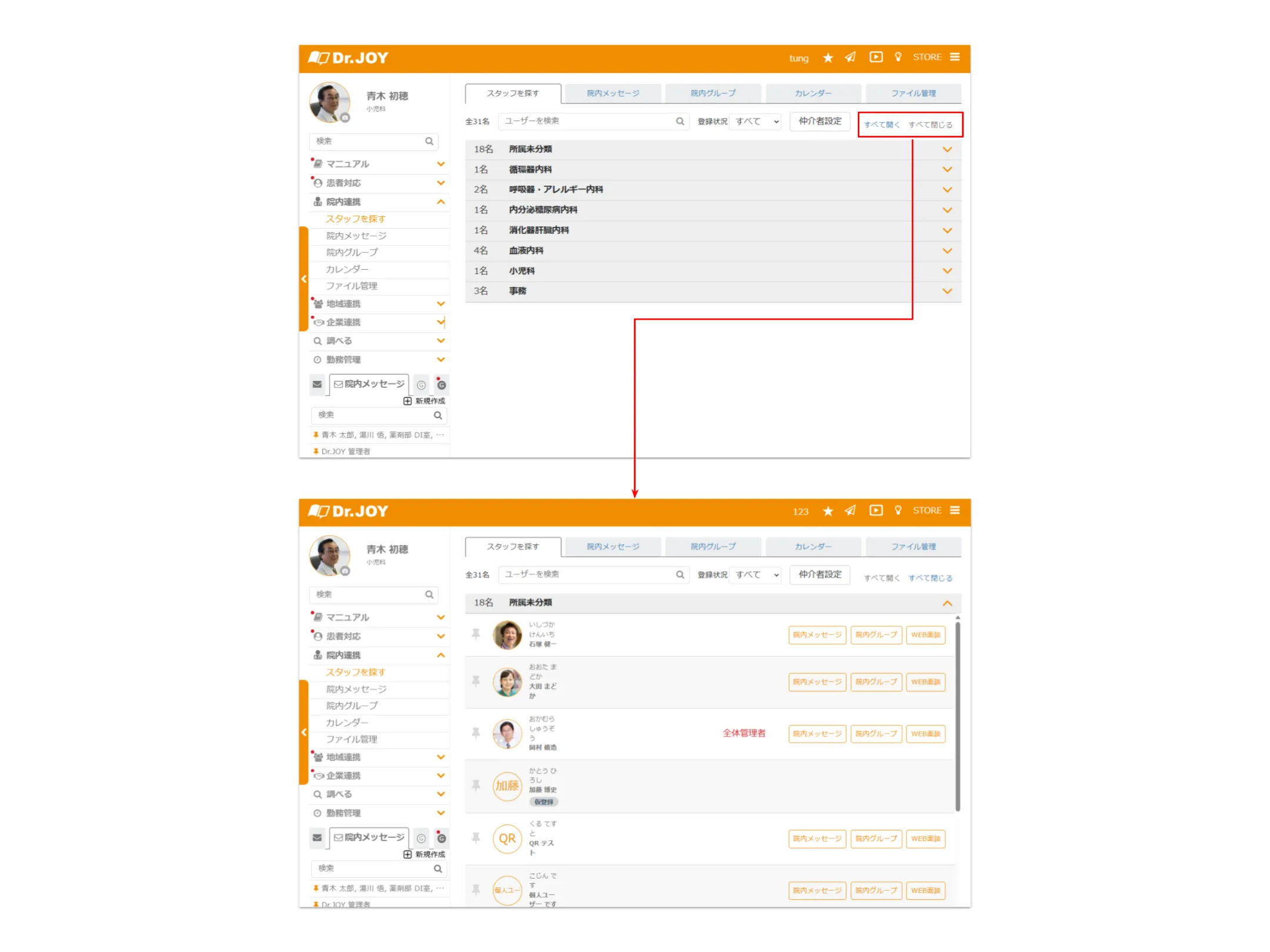 スタッフ名簿および医療従事者名簿において、従来は個別に展開・折りたたみを行っていた各セクションをワンクリックで一括操作できるようになりました。これにより閲覧や管理の手間が減り、日常業務の効率が向上します。