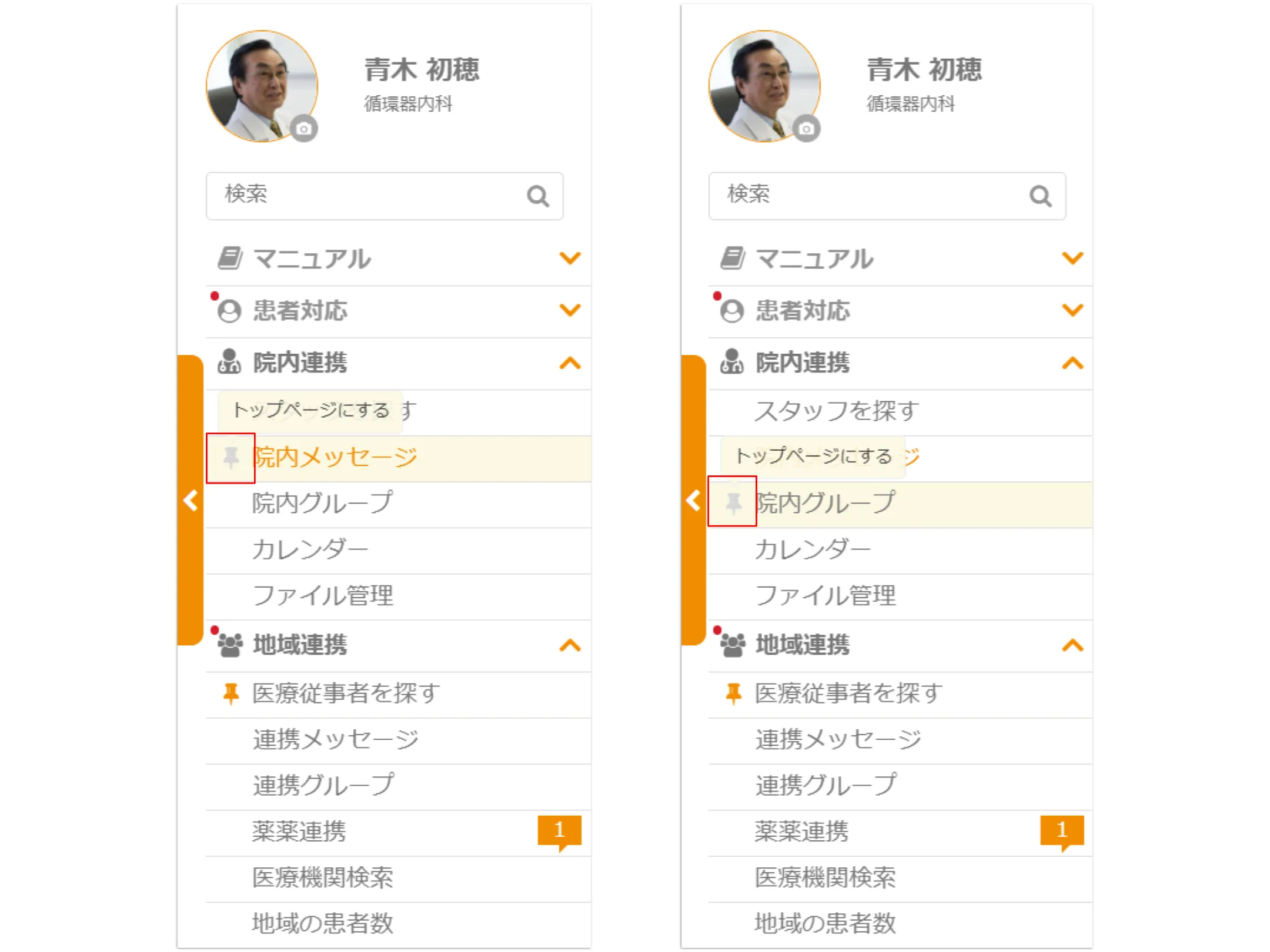 【「院内グループ」と「院内メッセージ」をサイドメニューにピン留めでき、ログイン後の初回画面に設定可能になりました。】
